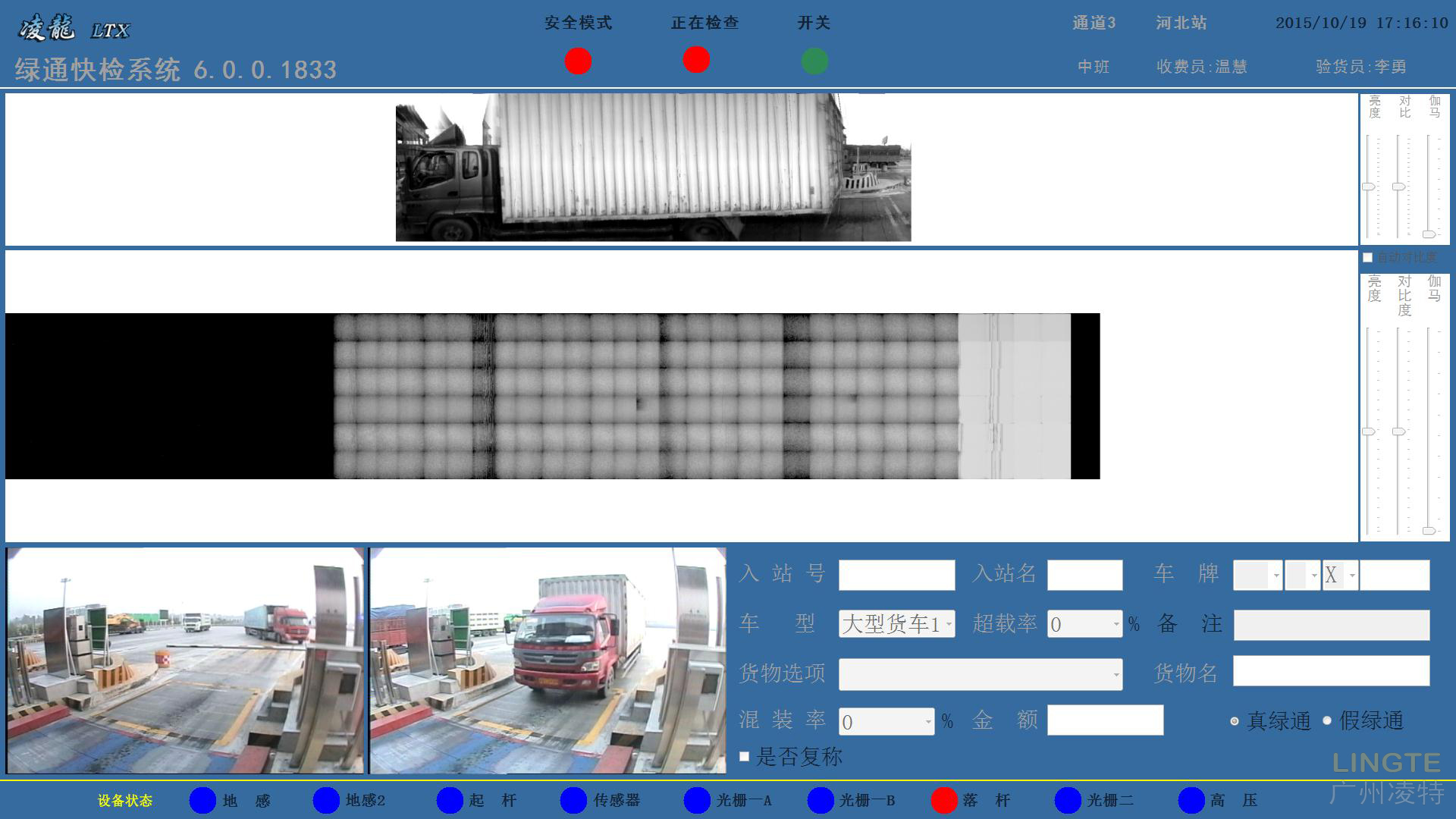 京石路此次安裝的X光綠通檢測設(shè)備,區(qū)別于常規(guī)的探頭檢測和放射線檢測裝置。它由一個Ⅲ類射線裝置、一個探測列陣裝置組成。該檢測設(shè)備利用Ⅲ類X光射線裝置發(fā)出的扇形射線透過車輛裝載的貨物,射線被另一側(cè)的探測器接收,利用不同貨物對X光射線吸收程度不同的原理,生成不同輪廓和形態(tài)的效果圖。工作人員可根據(jù)效果圖來判斷車輛是否屬于綠通車,從而達到快速準(zhǔn)確檢驗的目的。