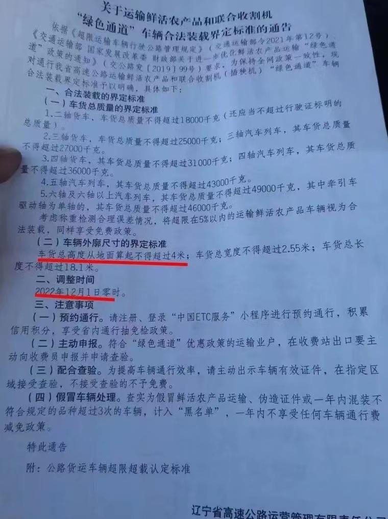 遼寧省高速公路運(yùn)營(yíng)管理有限責(zé)任公司于2022年12月1日實(shí)施的《關(guān)于運(yùn)輸鮮活農(nóng)產(chǎn)品和聯(lián)合收割機(jī)“綠色通道”車輛合法裝載界定標(biāo)準(zhǔn)的通告》。受訪者供圖