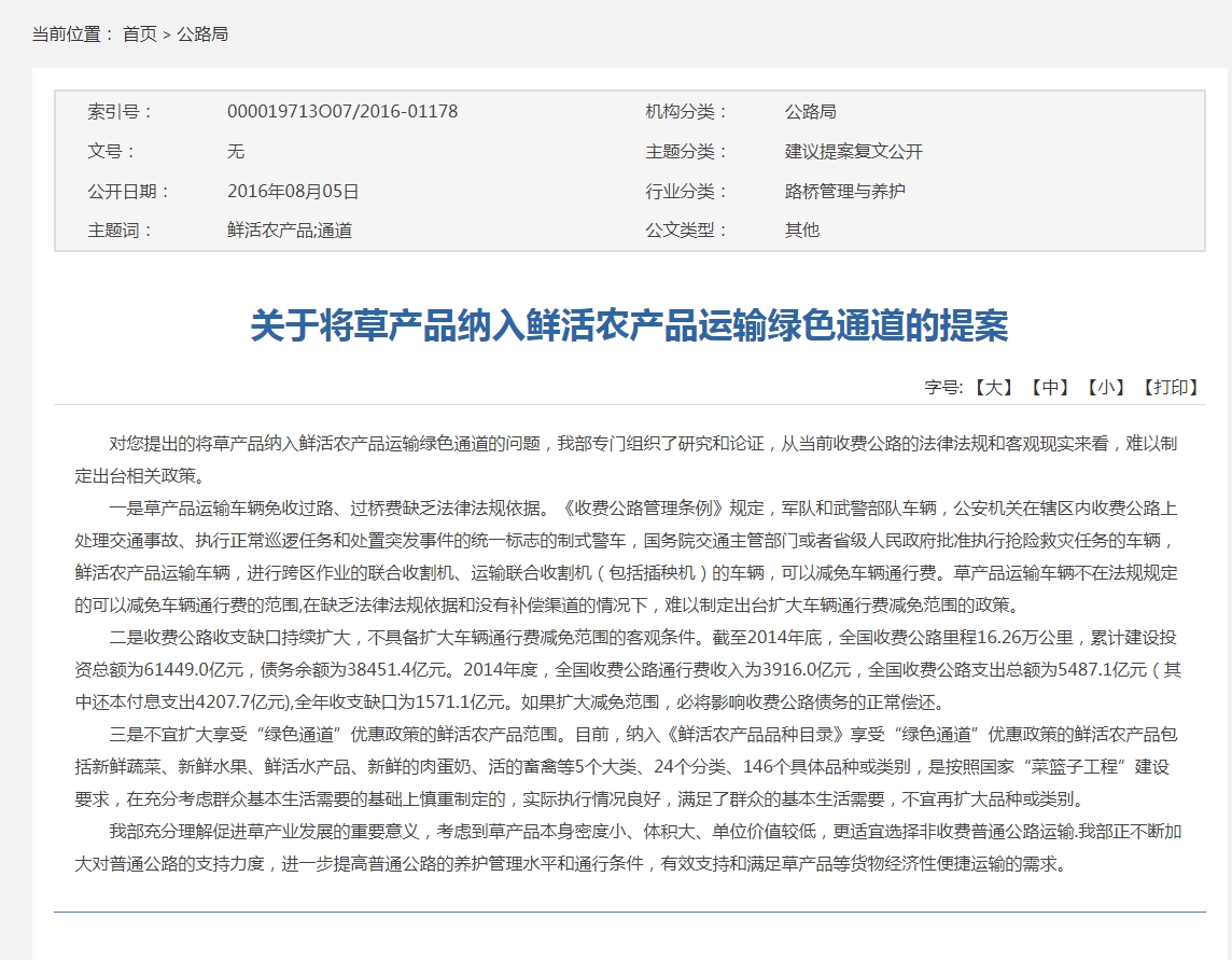 對您提出的將草產(chǎn)品納入鮮活農(nóng)產(chǎn)品運(yùn)輸綠色通道的問題,我部專門組織了研究和論證,從當(dāng)前收費(fèi)公路的法律法規(guī)和客觀現(xiàn)實(shí)來看,難以制定出臺相關(guān)政策。